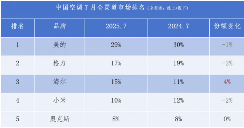 与此同时,竞争对手也在步步紧逼。奥维云网数据显示,在2025年7月中国空调全渠道市场份额市场排名中,美的以29%的市场份额继续领跑,保持其自2024年首次超越格力成为 “一哥”后的领先优势;格力位列第二,份额从去年同期的19%下滑至 17%;海尔则以15%的份额占据第三位,较去年同期提升了4个百分点。